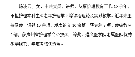 姓名:陈凌云 学历:本科 职称:讲师 所属专业:护理学