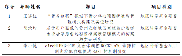 获批本年度国家自然科学基金立项的分别是研究生导师王连红、胡汝均及李小悦3人,经费合计86万元。其中,王连红导师获批项目是贵州省青少年护理心理学领域的突破,胡汝均及李小悦导师获批项目是贵州省急危重症护理领域的突破。