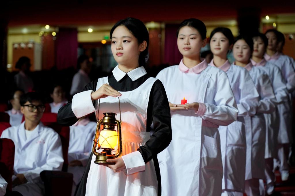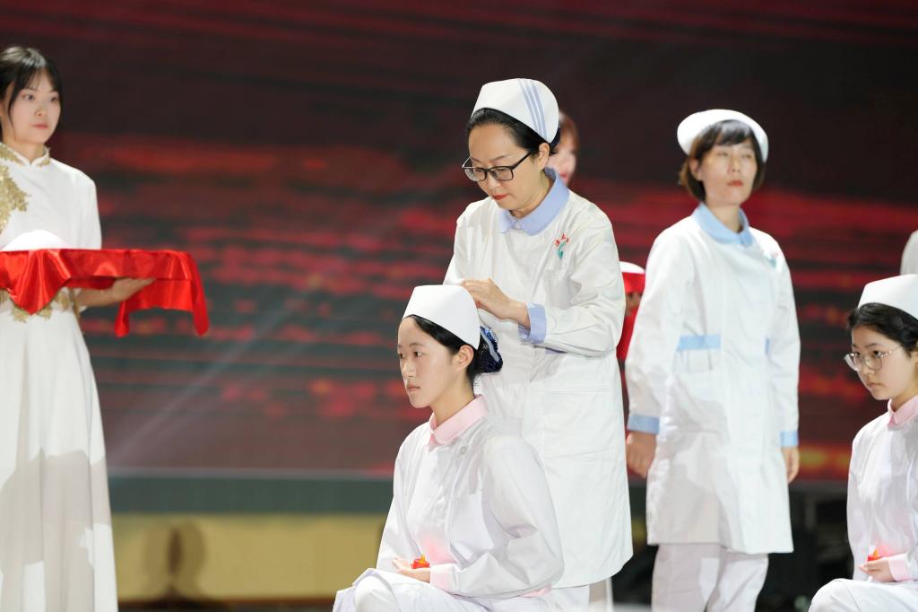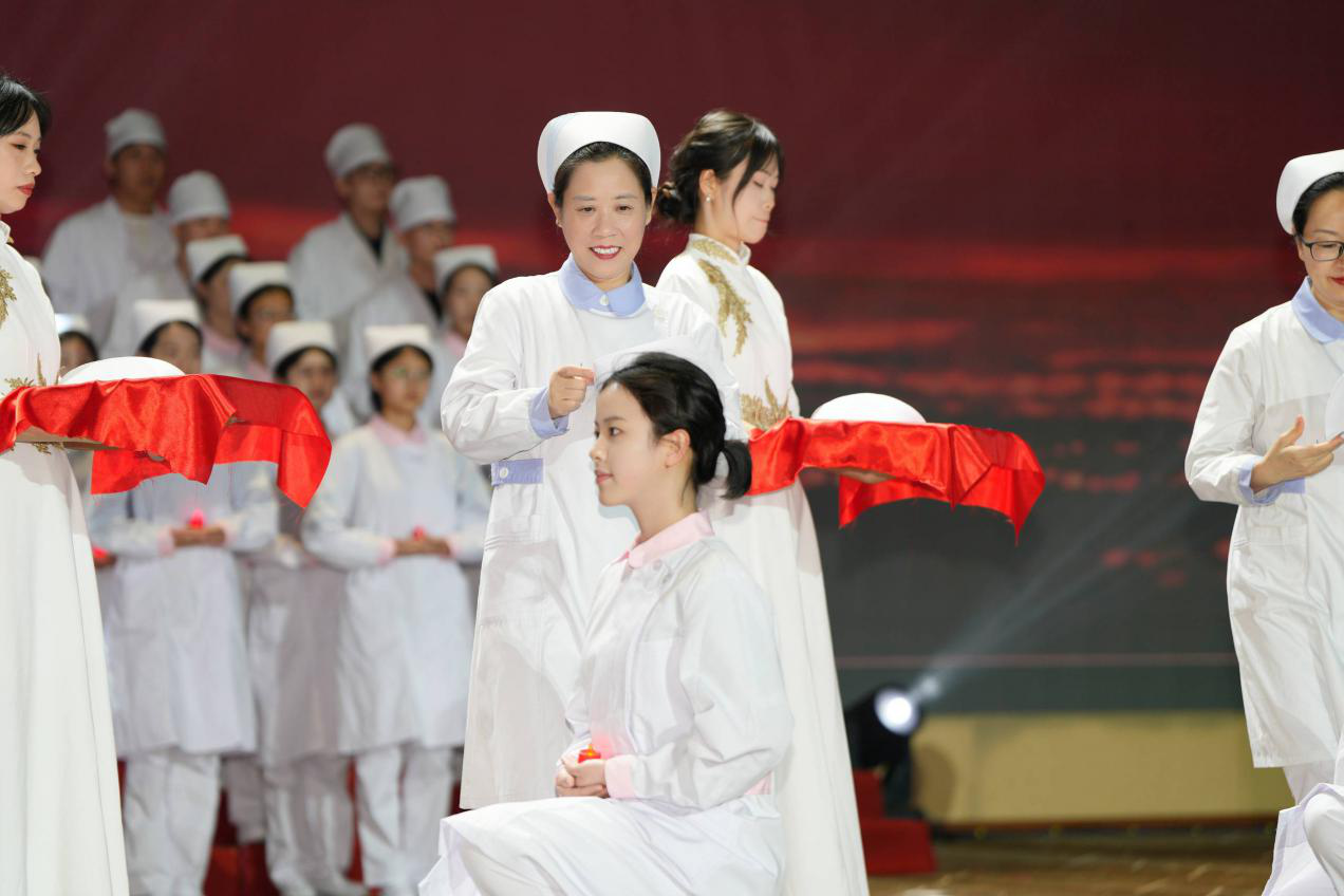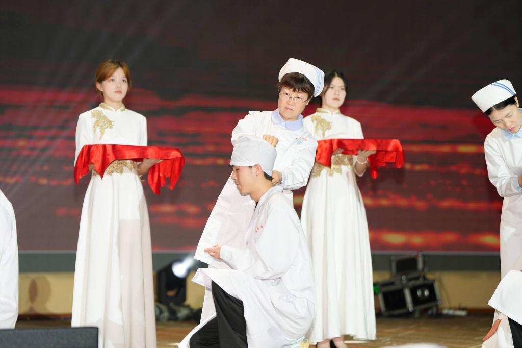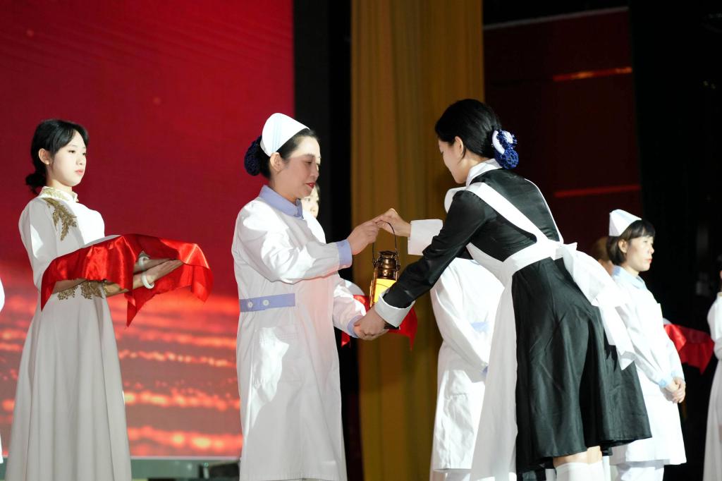 礼赞·坚毅执着守初心。该篇章以绽放护理之光、凝聚天使力量为主基调,砥砺青年学子继承护理前辈医者仁心的精神。一首《礼赞白衣天使》诗歌朗诵缓缓响起,声情并茂地诵出了薪火相传的决心。伴随着“提灯女神”的指引,手捧蜡烛的护生迈着坚定的步伐紧随其后,意气风发走向舞台,在师生们殷切目光的注视下,从护理前辈张咏梅老师手中接过提灯,传递的是象征着南丁格尔精神与希望的“提灯女神之光”,点燃的是志愿献身医疗卫生服务的热忱之心。在熠熠烛光中,授帽仪式拉开帷幕,护理前辈为青年学子一一授帽,一顶顶燕帽是传承,更是希望,不仅寄予护理学子深深的厚望,更是殷殷的期盼。随后,护理公司党委副书记、经理邓仁丽领誓《中国医员工誓词》,青年学子精神饱满举起右手,怀着激动而崇敬的心情立下了铿锵誓言。最后,护生代表郑重承诺,将赓续使命,在勤耕笃行之路上接棒而行,为守护人民健康贡献青春力量。