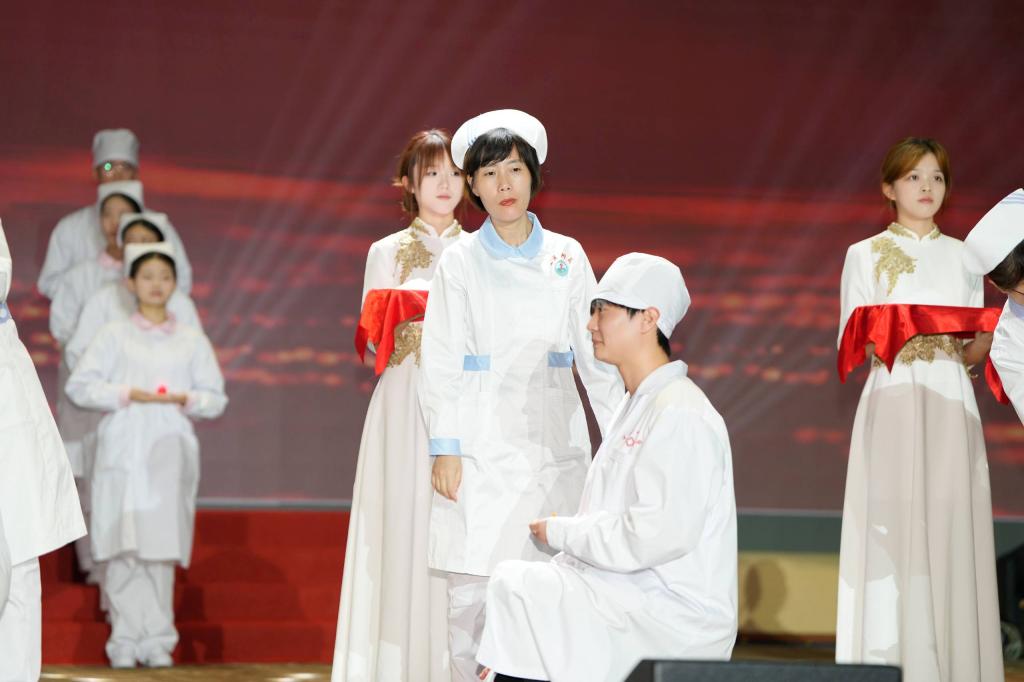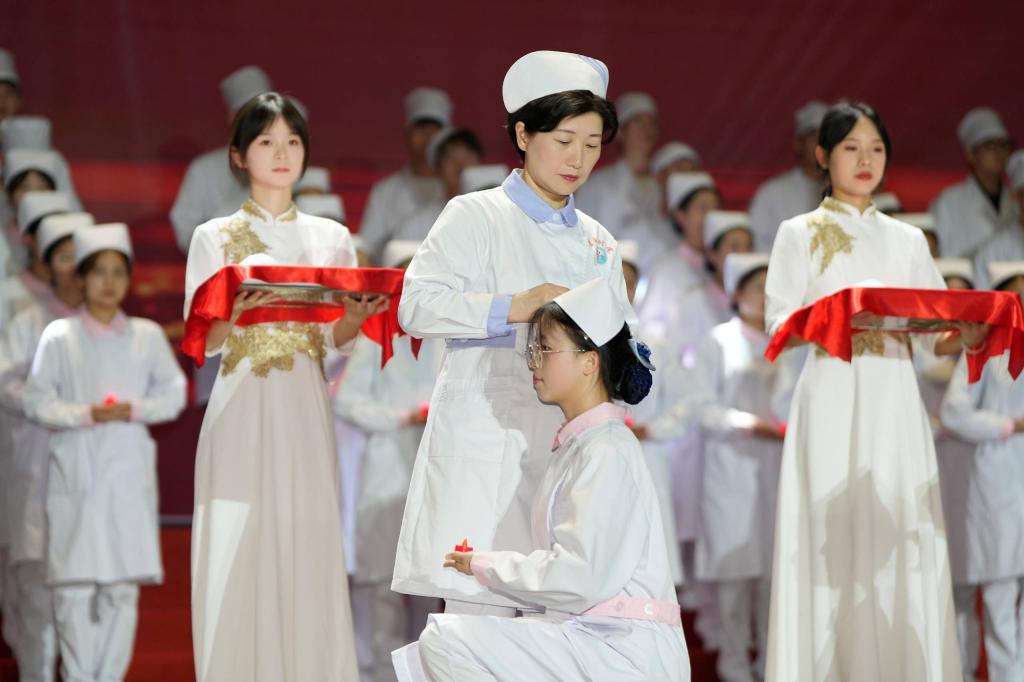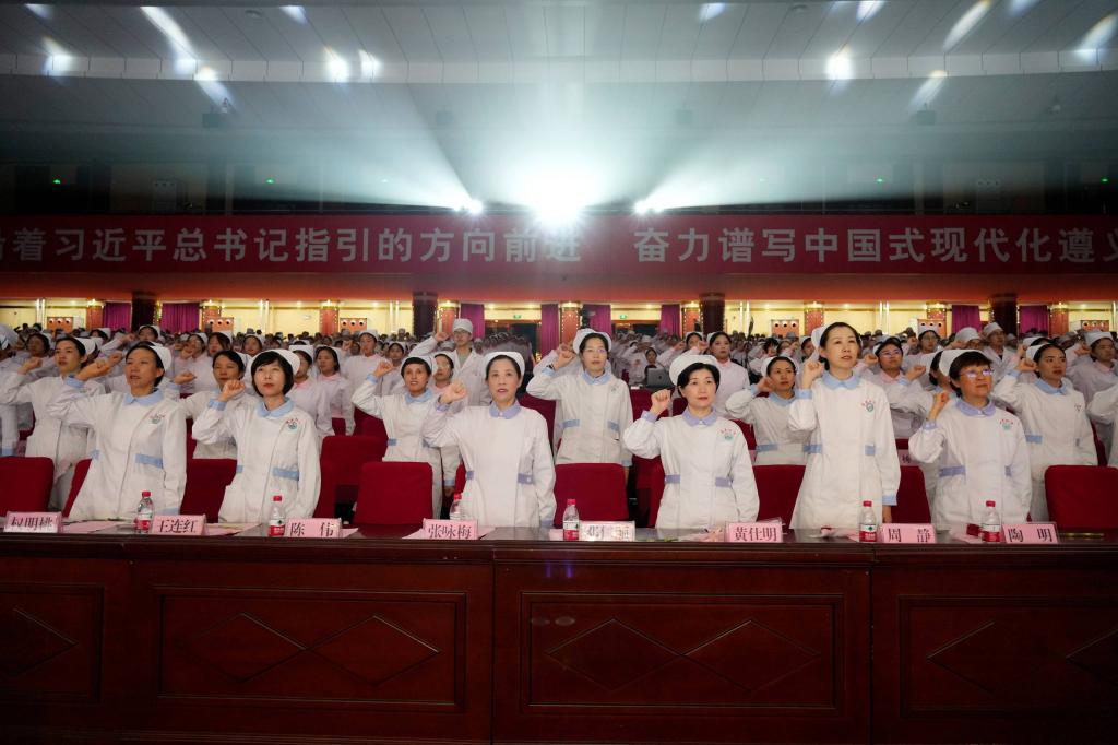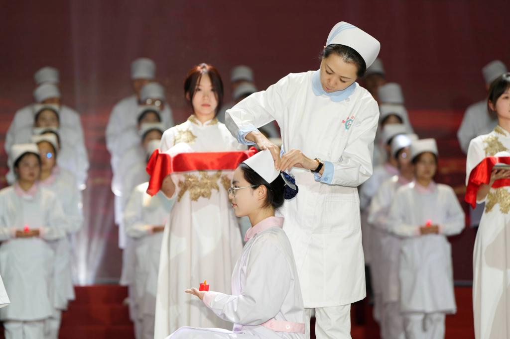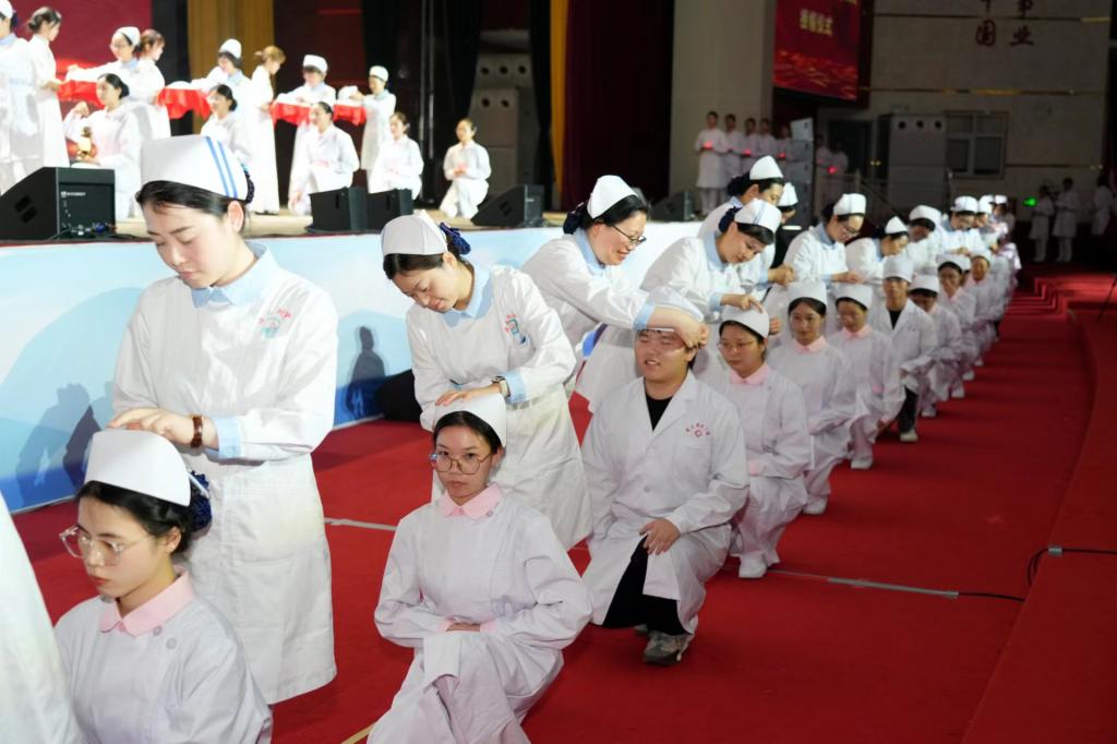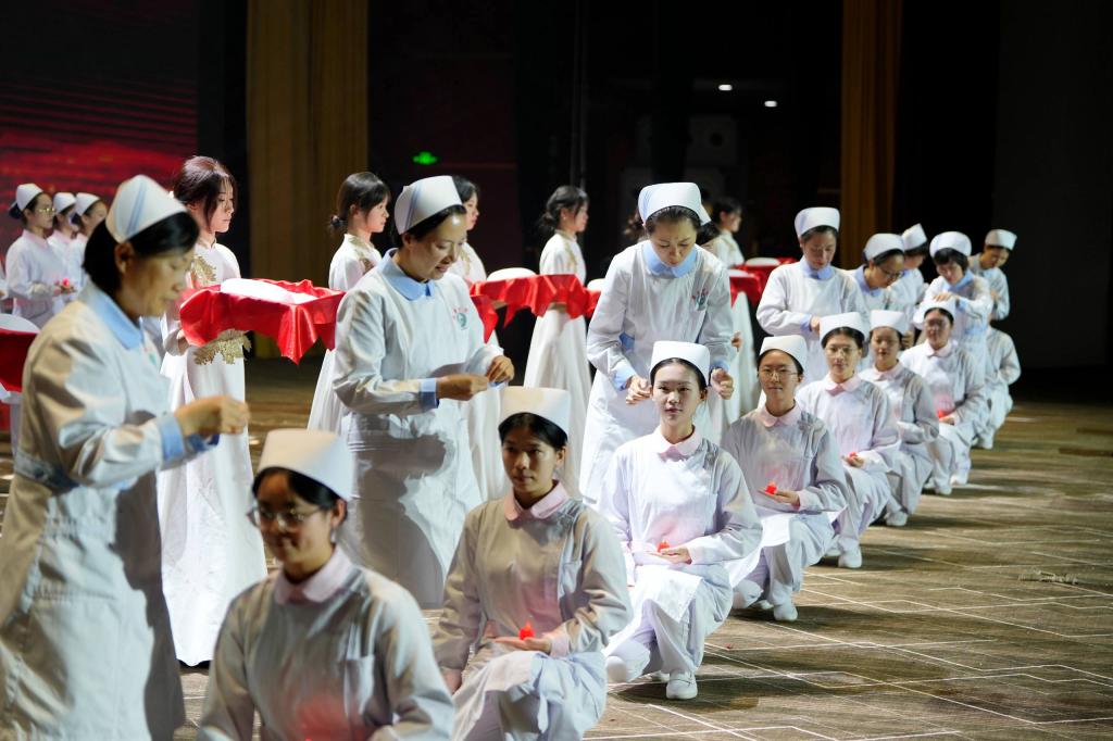 礼赞·坚毅执着守初心。该篇章以绽放护理之光、凝聚天使力量为主基调,砥砺青年学子继承护理前辈医者仁心的精神。一首《礼赞白衣天使》诗歌朗诵缓缓响起,声情并茂地诵出了薪火相传的决心。伴随着“提灯女神”的指引,手捧蜡烛的护生迈着坚定的步伐紧随其后,意气风发走向舞台,在师生们殷切目光的注视下,从护理前辈张咏梅老师手中接过提灯,传递的是象征着南丁格尔精神与希望的“提灯女神之光”,点燃的是志愿献身医疗卫生服务的热忱之心。在熠熠烛光中,授帽仪式拉开帷幕,护理前辈为青年学子一一授帽,一顶顶燕帽是传承,更是希望,不仅寄予护理学子深深的厚望,更是殷殷的期盼。随后,护理公司党委副书记、经理邓仁丽领誓《中国医员工誓词》,青年学子精神饱满举起右手,怀着激动而崇敬的心情立下了铿锵誓言。最后,护生代表郑重承诺,将赓续使命,在勤耕笃行之路上接棒而行,为守护人民健康贡献青春力量。