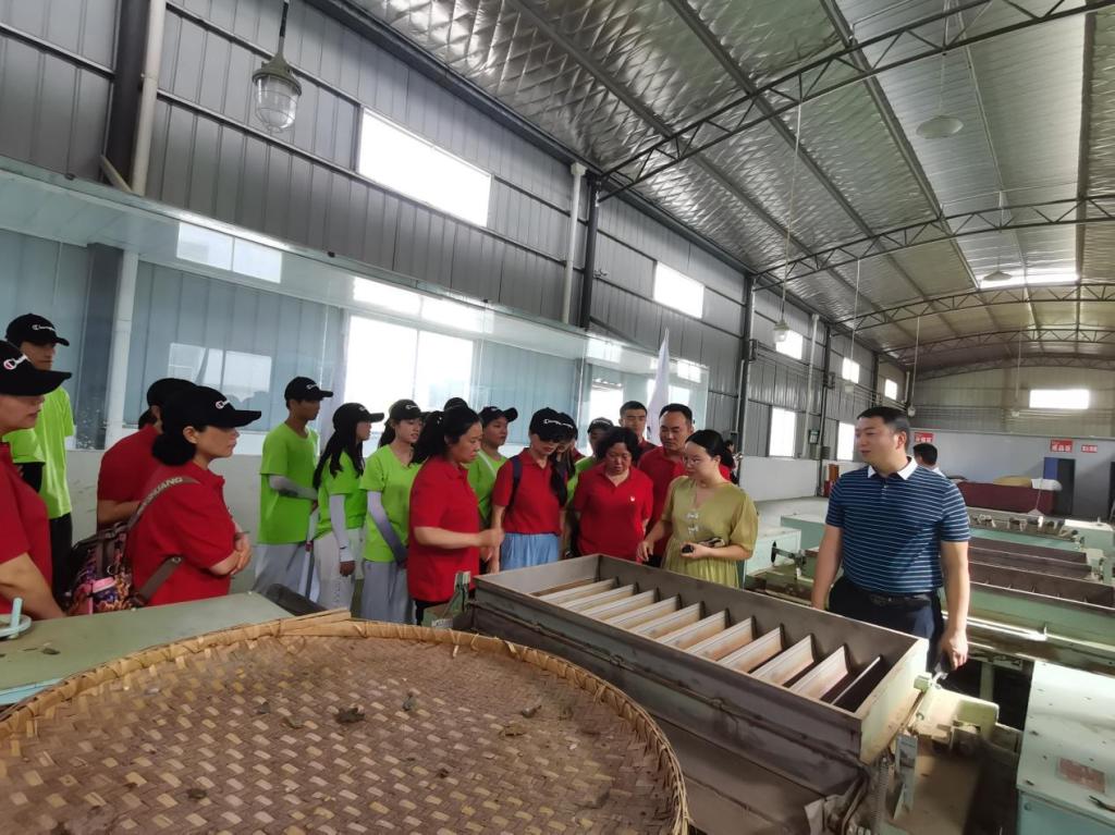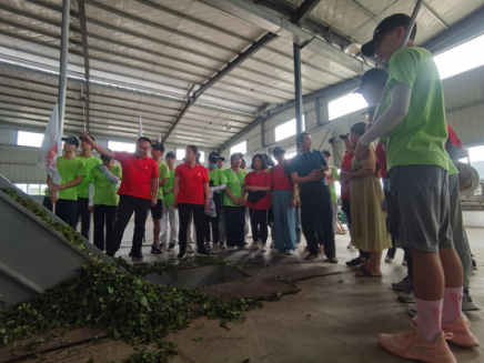 走进茶园,在茶农的指导和示范下,师生们认真领会采摘技巧和要领,随即变身“茶农”投入到采摘的劳动中。同学们手挎竹篮在茶园里穿梭忙碌,一片片嫩绿的茶叶迅速装满了竹篮。采茶现场,员工们化身“销售员”,同杜富佳书记一起走进直播间,助力现场直播带货,生动活波的直播方式吸引了大量网友观看,并成功将线上流量转换为了线下的销售量。在杜富佳书记的陪同下,师生们参观了当地的茶厂,茶厂负责人从制茶流程、制茶工艺、经营情况等方面给大家作了详细讲解,让大家对茶产业有了更深入的了解。同时,公司党委书记张咏梅,党委副书记、经理邓仁丽结合学科,就老员工创新创业课题拓展与企业负责人进行交流。