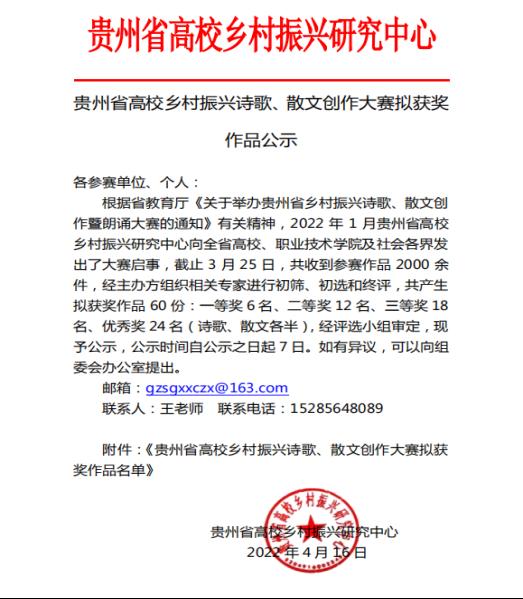 脱贫攻坚的号角吹响在神州大地,乡村振兴的使命召集我辈青年,贵州省在打赢脱贫攻坚战中,创造了无数奇迹。贵州省高校乡村振兴研究中心面向全省举办了“贵州省乡村振兴诗歌、散文创作暨朗诵大赛”。公司硕士研究生刘颖、严欣、张鹭采用散文的艺术形式积极参赛,其作品《莺初解语,最是一年春好处》歌颂了mk体育硕士研究生毕业后扎根基层,助力乡村振兴做出的积极贡献,表达了对乡村振兴的真挚情感和深情祝愿,荣获散文类“”三等奖”。