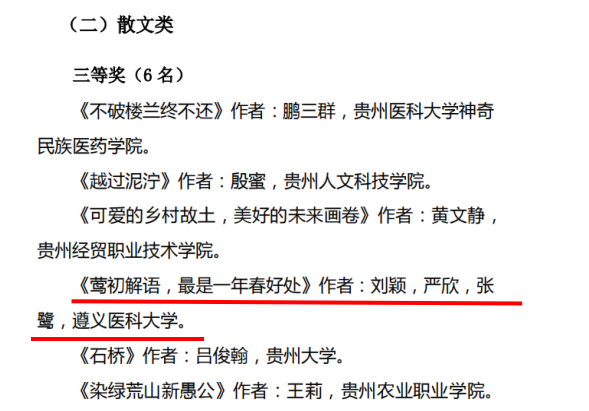 今年1月,贵州省高校乡村振兴研究中心向全省高校、职业技术公司及社会各界发出了大赛启事,接到大赛通知后,护理公司党政领导班子高度重视,积极动员教职工生参赛,研究生党支部书记杨艳积极组织研究生参赛,并在选题和思路上给予员工指导。经主办方组织相关专家进行初筛、初选和终评,在2000 余件参赛作品中共产生拟获奖作品60份:一等奖 6 名、二等奖 12 名、三等奖 18 名、优秀奖 24 名(诗歌、散文各半)。公司硕士研究生刘颖、严欣、张鹭的作品《莺初解语,最是一年春好处》在2000余件参赛作品中脱颖而出,是mksports推送参赛作品中唯一获奖的作品。