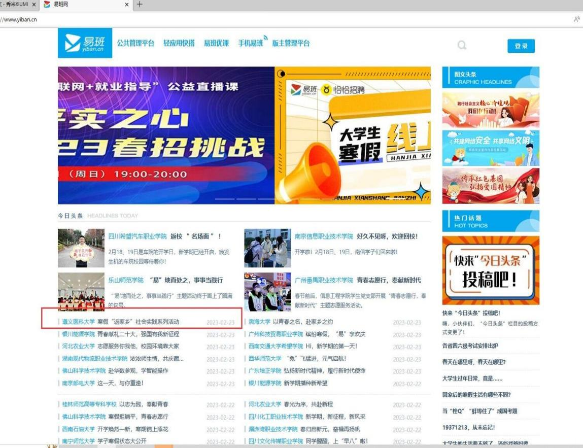 易班网头条版块链接:https://s.yiban.cn/app/2004734/post-detail/LNdsJMoA6m64NgG