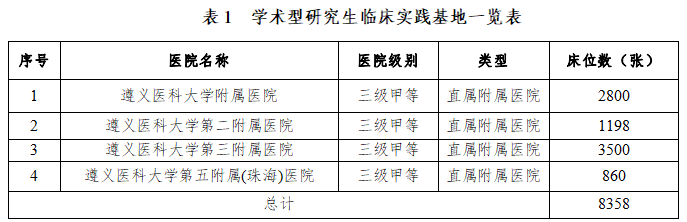 学位点为国家一流本科专业建设点、贵州省重点学科,拥有国家级虚拟仿真实验教学中心及国家级临床技能实验教学示范中心各1个,国家级临床重点专科10个(其中护理学国家临床重点专科1个)、护理学创客空间1个、公司医学大数据研究中心1个;共享公司教育部重点实验室1个(基础药理教育部重点实验室)、省级重点实验室3个,附属医院国家临床研究中心分中心3个、国家级生物样本库1个、公共实验室平台1个;学位点的4家临床实践基地均为三级甲等医院(见表1)。